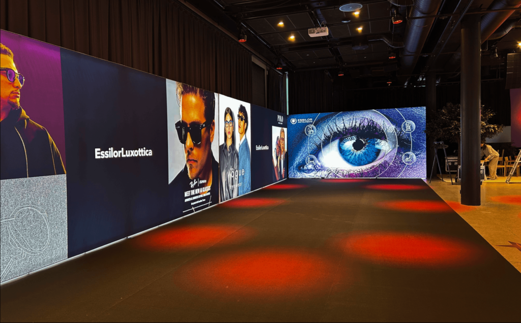 The same lightwall system carries through the space — shaping entrance portals, registration areas, supplier desks, stage backdrops and wayfinding — creating a consistent look without feeling repetitive.